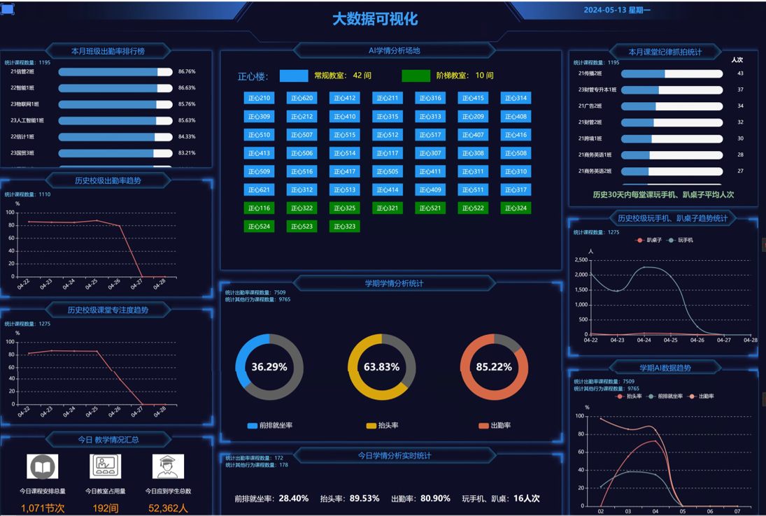 AI无感考勤(学情分析系统)数据驾驶舱页面可集中统计校内所有教室的无感考勤数据,包括出勤率排行、违纪行为统计、专注度趋势、校级三率综合统计等。